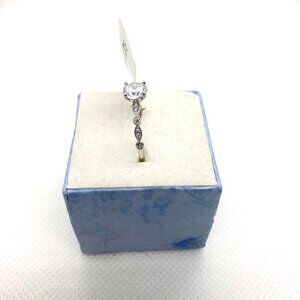 Size 8. Solid 925 sterling silver ring. The focal point of the ring is a round cut clear / white CZ stone, skirted by tiny clear stones and detailing on either side of the band. Stamped 925 on the inside of ring.