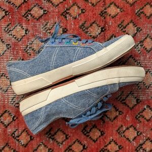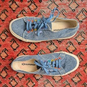 Blue denim Superga sneakers with multi-colored rainbow eyelets.
