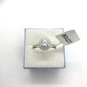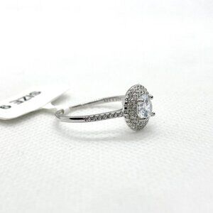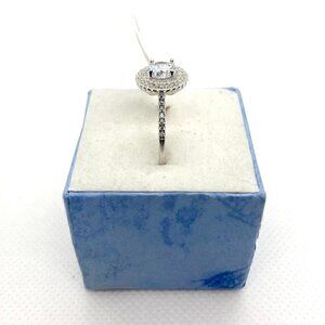 Size 9. Solid 925 sterling silver ring. The center point of the ring is a round cut clear / white CZ stone, surrounded by a two halo layers of tiny clear stones, more of which line partway down the band. Stamped 925 on the inside of ring.