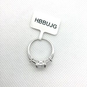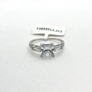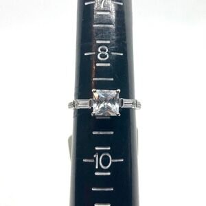 Size 9. Solid 925 sterling silver ring. The center point of the ring is a square cut clear / white CZ stone, skirted on both sides by CZ baguettes and tiny clear stones. Stamped 925 on the inside of ring.