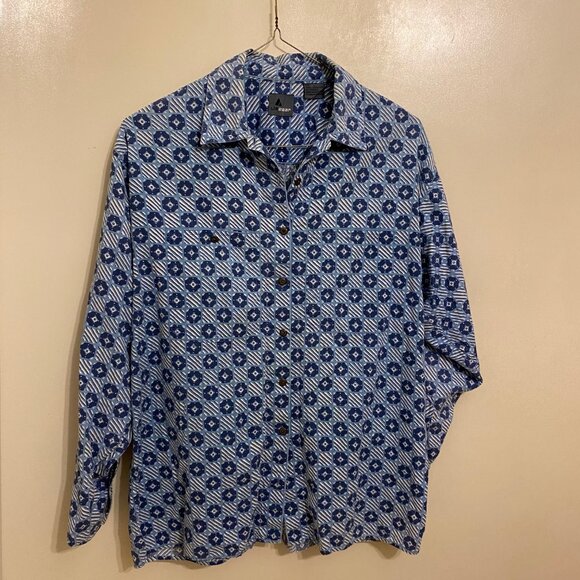 Vintage button down long sleeve shirt, beautiful blue print, excellent condition, Liz Wear, 100% cotton.