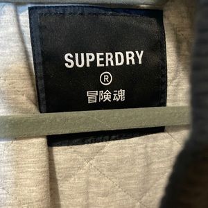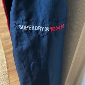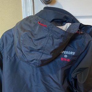 Navy blue with red detailing and gray inside. Slightly worn SUPERDRY jacket. Size is R in SUPERDRY sizing