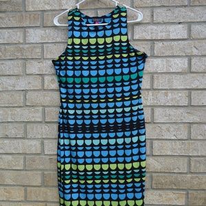 SIZE S. Vince Camuto women's geometric design dress. Has excellent stretchy material. Shell-95% polyester and 5% spandex, fully lined with 100% polyester. Approx measurements: Pit to pit 18". Length 38". From a smoke free home. Good preowned condition. Please zoom in all pictures for details & condition and review all pictures carefully to judge condition prior to purchasing. Item in pictures is the exact item you are purchasing.