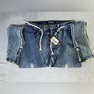 Designed specifically for athletic builds, these jeans from Size feature a tapered cut with extra room in the thighs and calves — ideal for bodybuilders or guys with muscular legs. Mid-rise waist with a shoelace-style drawstring for adjustable comfort. Distressed wash, ripped knees, and zippered ankle openings give these a modern edge.