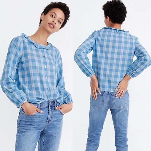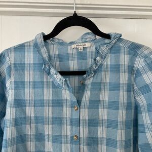 SIZE XS Madewell Ruffle Neck Top Colwell Plaid Blue & White Gingham