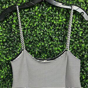NEW. A sleek and bodycon, black & white stripe dress. Smooth, neoprene texture, knee-length, and spaghetti straps. Smoke/pet free.