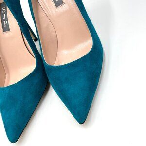SJP by Sarah Jessica Parker women's Fawn 70 teal blue suede leather pointed toe stiletto heels / pumps. Women's size 38, which according to the SJP size chart is equivalent to a US size 8. (See last photo for size chart taken directly from the SJP website.)