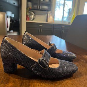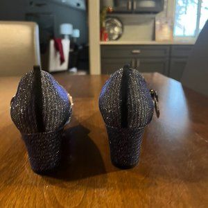 Elegant blue heels with glitter finish. Features a stylish buckle strap. Perfect for special occasions.