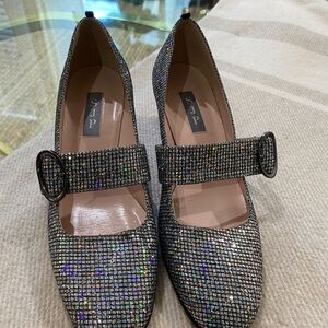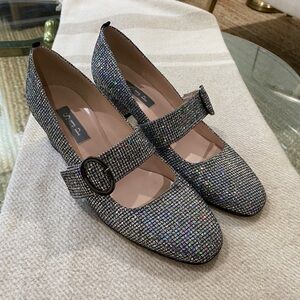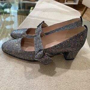 One of our most popular and coveted sjp collection silhouettes. a sweet mary jane on a lower, chunky heel. very sparkly, very fun. and seriously one of the most comfortable shoes you will ever own.