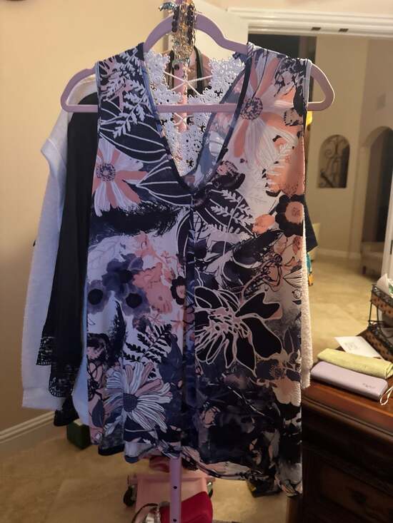 SJS Sleeveless Floral V-Neck Tank Top with Lace Detail Back. This vibrant top features a mix of peach, navy, and white floral patterns with a unique crochet lace panel on the back. Lightweight and comfortable fabric makes it perfect for warm weather or layering under a cardigan.