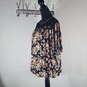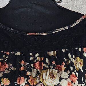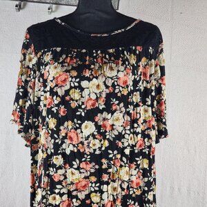 SJS Black Salmon Cream Floral Rayon Span Short Flutter Sleeve Lace Neck Hi Low Top Size 3X...Great Looking colorful Top with Lace Inlay Around the Neck to Add some Drama...Nice Flowy top.....Like New.....