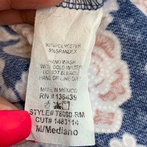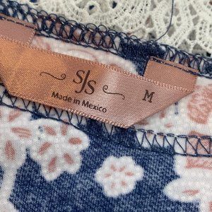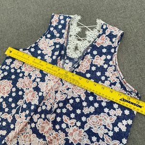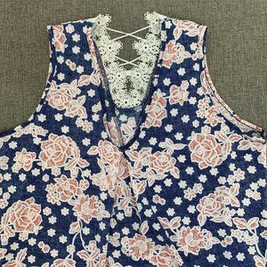 SJS Floral Sleeveless Blouse Pink Blue Medium Crochet Lace Detail Scoop Neck
