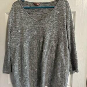 SJS Gray V-Neck 3/4 Sleeve Top with Silver Moon 🌙 & Stars ⭐️ Size 1X