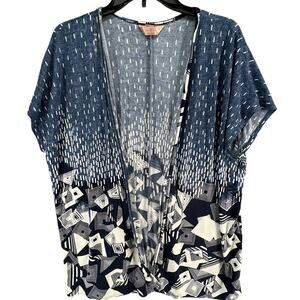 SJS Kimono Cardigan Womens Size 2X Blue Geometric Open Front Relaxed Layering Coastal Flowy