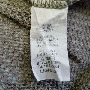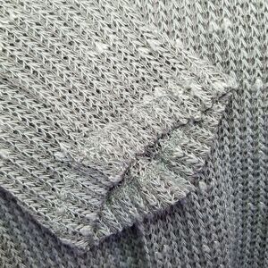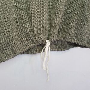 This is an open weave green cropped hoodie from SJS. It is a moss green color. The fabric is a thin knit with a swizz dot pattern. This would look great over a tank or crop top. The hem is drawstring style that can be worn up as a crop or lower as a traditional hoodie. the sleeves are 3/4 length.