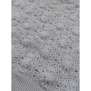Cream, ivory or off white color crochet sweater in an abstract floral like pattern. This is all over cream - some pictures look almost ombre but this is not the case. Hand crochet. 100% mercerized cotton. Size tag says M but measurements indicate that this is a small medium, with a 17" flat lay pit to pit.