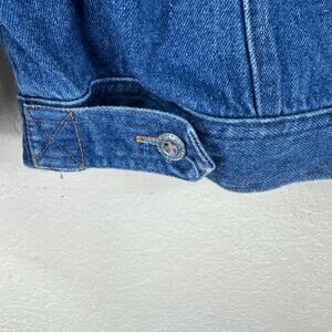Vintage SK Wear petite denim jacket with southwestern patchwork lining and unique front zip pocket detail, classic Y2K utility style with contrast stitching and button front closure, perfect retro western boho grunge layering piece for fall or everyday wear, 100% cotton soft midweight denim with a relaxed cropped fit, versatile statement piece pairs well with skirts, dresses, or boots for a true eclectic look
