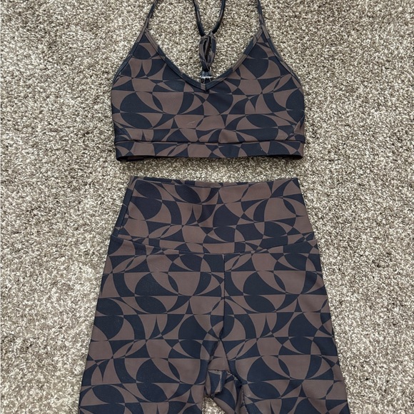 Stylish sports bra and shorts set with a geometric pattern. Features a mix of dark and light colors.
