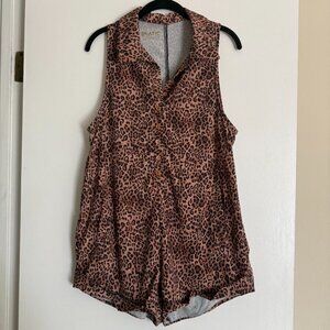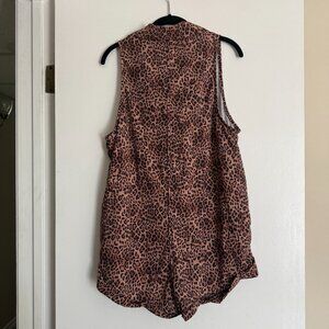 SKATIE Wyatt Sleeveless Romper in Leopard Print, size medium. Cuffed shorts and button closure, with neck collar. Shorts have pockets! Material is more like a swim material, so it is lightweight. 79% recycled polyester, 21% spandex. Loose, casual fit. Only worn 1 or 2 times.
