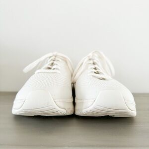 Sporty engineered knit mesh fabric upper in a lace up sporty casual comfort walking sneaker with Arch Fit removable supportive cushioning insole system and cushioned midsole.