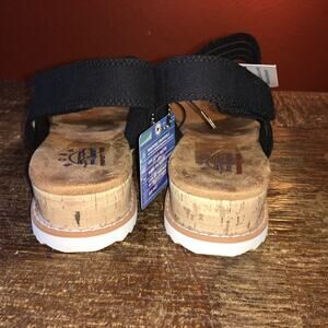 This is a new with tags pair of Bobs from Skechers Desert Kiss sandals in color Shore Enough (Black). Womens size 10. Vegan. Cork Heel. Hook and Loop adjustable ankle strap. 1.75" heel, 0.5" platform.