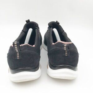Skechers Empire Delux Spotted Relaxed black rose gold sneakers. Slip on, bungee cord, black & pink shimmer, Air Cooled Memory Foam insole, size womens 8.5. Excellent pre-owned condition, no flaws or defects. Smoke and pet free home.