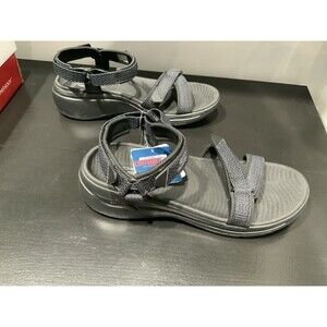 Adjustable hook and loop closures at toe, instep, and heel straps.