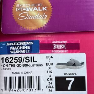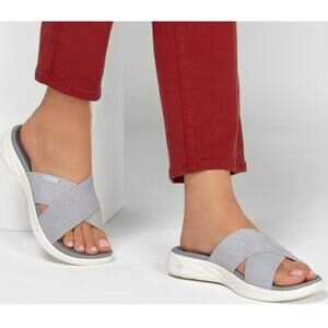 Add some sparkle to your sunny-day style with added comfort in the Skechers On the GO 600 - Glistening Silver sandal. Soft woven metallic finish fabric in a sporty casual comfort cross strap slide sandal with Goga Mat® Contour Footbed and Skechers GO run 600 design sole.