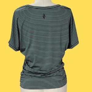 Crafted to keep you cool by efficiently wicking moisture away from your skin, this shirt is an ideal choice for your workout sessions. It features a refreshing green hue with stylish black pinstripes and is designed with a banded waist for added comfort. Size L.