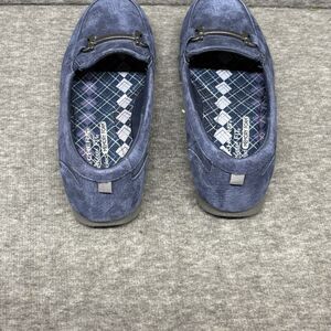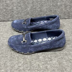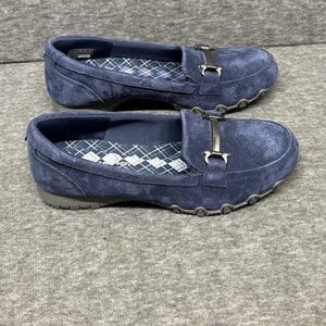 These Skechers relaxed fit memory foam women's shoes in size 8M feature a blue suede leather design with a slip-on closure and round toe shape. The shoes are cushioned for comfort and have a memory foam insole for added convenience. The buckle accent adds a stylish touch to the casual slip-on style, making them a practical and comfortable choice for everyday wear. Made by Skechers and manufactured in Vietnam, these shoes provide a relaxed fit and are sure to become a favorite in any woman's wardrobe.