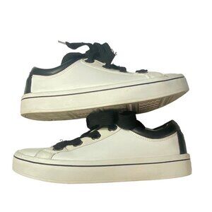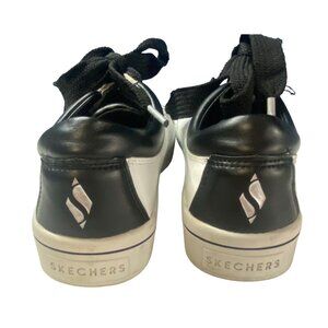 These SKECHERS Women Hi Lite Lace Up Sneakers in size 8 feature a white and black color scheme with a 90s-inspired design. The sneakers have a solid pattern with a leather synthetic upper and lace-up closure for a comfortable fit. Ideal for casual everyday wear, these athletic sneakers from the Skechers Hi Lite model offer a mix of style and comfort with their colorful theme and comfort features.