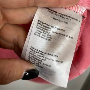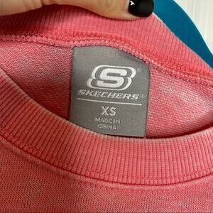 Skechers Pink crew neck sweatshirt with logo on sleeve. Lightweight burnout fabric. Fabric content is 55% cotton and 45% polyester. The measurements are as follows: 21.5 inches across from armpit armpit, 23 inches in length, 21 inches across the shoulders, and sleeve length is 21 inches from shoulder seam to wrist. All measurements are approximate and taken while laying flat.