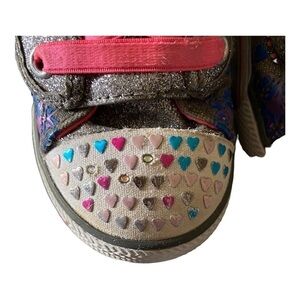 girls silver and floral shoes, twinkle toes, the toes of the shoes are covered in hearts and lights that light up and twinkle when you walk, laces are for looks the shoes have a Velcro closure, super cute, great condition, girls size 8