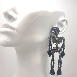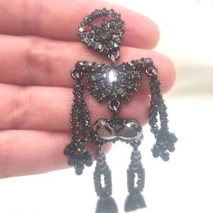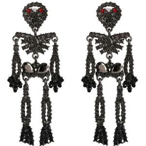Get your spooky on this halloween with these bling skeleton earrings that have movable joints cha cha cha. 💋Video a different color stones added to show movement.💋Materials Alloy and black Rhinestones Weight 38.5 grams Measurements 1" x 3.25"💋 New without tags Comes in a jewelry pouch with extra backs