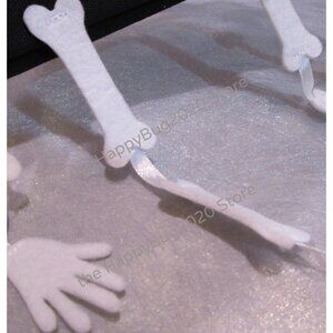 Front printed with white skeleton that has Felt and ribbon arms and legs that move!