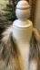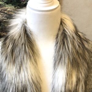 This beautiful open front vest / sleeveless cardigan has a faux fur collar and a knit bodice. Waterfall style. Medium in weight and a fun upgrade to your outfit for any day or evening activity! The armholes and bottom of the vest have a ribbed finish. Soft and medium heather gray color vest. White and gray Faux Fur.