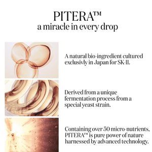 PITERA™ - SK-II’s proprietary, natural bio-ingredient derived from fermentation. It improves multiple dimensions of visible skin damage and aging. PITERA stimulates the natural reproduction of the skin’s Hyaluronic Acid via hydration.