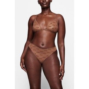 - This sexy and trendy mesh thong from Kim Kardashian's SKIMS. Features logo embossed, T-back string, mesh fabric, and 100% cotton gusset.