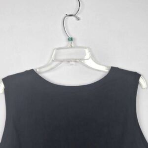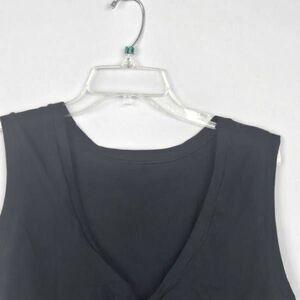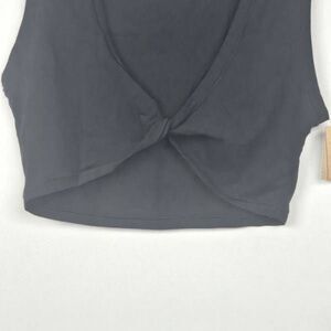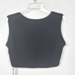 Really cute and comfortable. This cropped tank has a V neck with a twist in front. Cotton, elastane fabric. Color is Soot, size 3x.