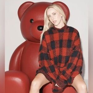 NWT. Size: S/M Stay warm and styish in the SKIMS Cozy Knit Buffalo Check Hoodie. This ultra-soft, oversized hoodie features a classic red and black buffalo check pattern, perfect for lounging at home or making a bold statement on the go. Made from the signature SKIMS boucle knit, offers a plush, cloud-like feel ...+h a relaxed fit for maximum comfort. r The pullover design makes it easy to throw on, while the cozy texture keeps you snug all day long.