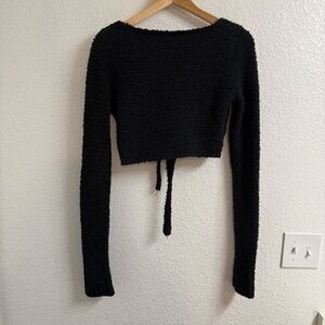 A feminine long sleeve wrap top that is made for the perfect level of warmth and comfort. Features functional wrap ties to tie at wearer's back.