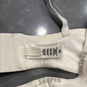 This cream bra features molded cups and adjustable straps for a personalized fit. Its smooth fabric offers a slight sheen, adding a touch of elegance to its functional design. The sturdy construction ensures lasting comfort and support. Never worn.