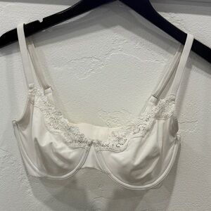 Soft cream bra with delicate lace trim. Offers comfort and elegance. Ideal for daily wear.