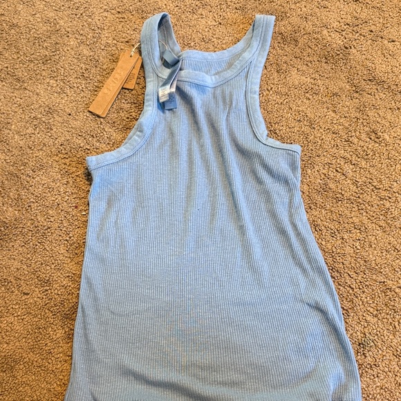 Ribbed knit tank with a racerback cut. Soft stretch fabric for a snug, comfortable fit. Minimalist design suited for layering or solo wear. Light blue offers a fresh, casual look.