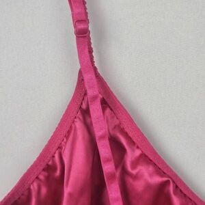 Soft and comfortable. Satin fabric is polymide elastane. Adjustable straps, hook and eye back closure and elasticized all around. Raspberry color, size 4x.