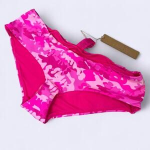Brand new with tags and hygiene liner attached, these SKIMS swim bottoms feature a vibrant hot pink camo print with a flattering mid-rise fit and cheeky back coverage. This limited edition style from Kim Kardashian’s SKIMS swim collection is ultra-flattering and trendy — perfect for vacay, festivals, or poolside selfies.