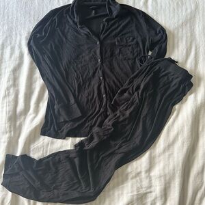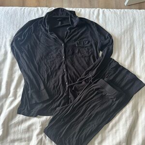 Comfortable black button-up pajama set with long sleeves and pants.