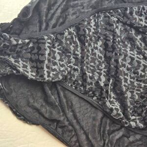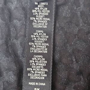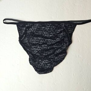 Cute and comfortable. Ful front and back panel, sides are string. Flocked logo all over. Fabric is nylon, polyester and spandex with cotton lined gusset. Soot color, size 2x.