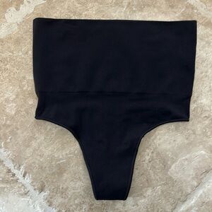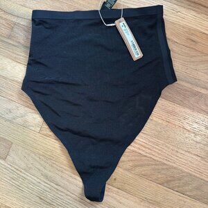 Wear this perfectly stretchy, shapewear high-waisted thong for a flat tummy and cinched waist without bulk or panty lines. Features a high waist fit that hits right below the bust, an interior silicone underband to prevent roll-down, a cotton gusset, and a wide crotch for added coverage. Fits true to size.