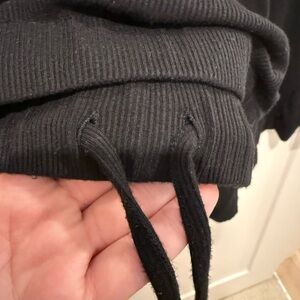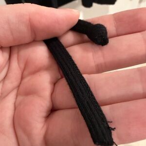 One side of the drawstring on the pants came untied, so only one string is knotted. See photo. Not a flaw, I just didn’t want to attempt to make them even and fail!